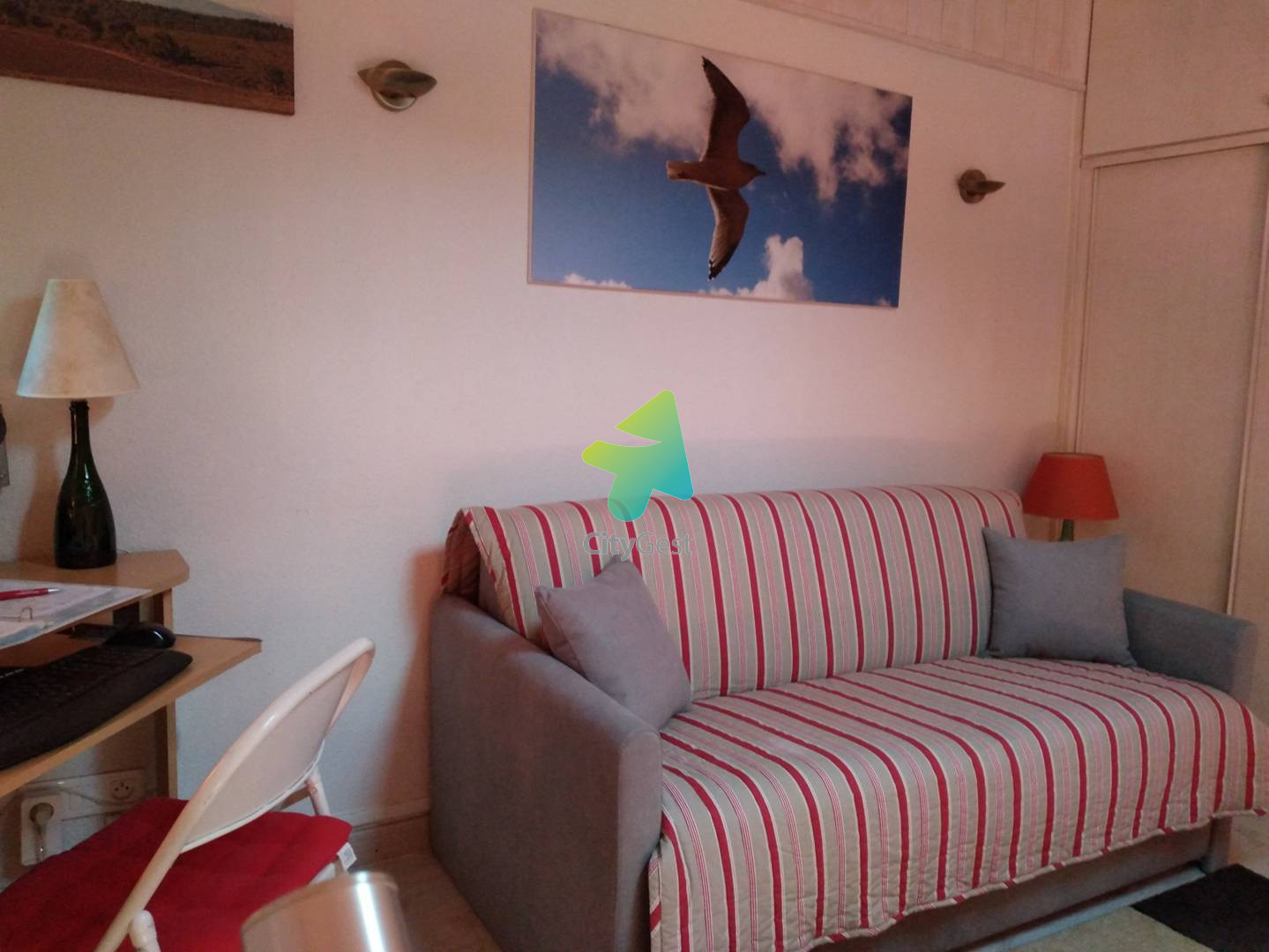 Appartement meublé équipé pour 2/4 personnes. Résidence Santa Marina à 900 de la plage et des commerces. Terrain de tennis, piscine collective ouverte en saison et parking privé, avec wifi. Classé 2 étoiles. Situé au deuxième étage du bâtiment B composé d'une entrée couloir desservant une cabine avec 2 lits superposés en 90 cm, cuisine équipée avec coin repas et TV. Chambre séparée avec 1 lit pour 2 personnes en 140 cm. Mezzanine avec canapé convertible pour 2 personnes et espace bureau. Salle d'eau avec douche, lavabo et wc. Prestations supplémentaires optionnelles: le linge de maison n'est pas fourni mais il est possible de le réserver à l'avance et de le récupérer à la remise des clés (kit lit double: 12.00 euros/ kit lit simple: 9.00 euros / kit serviette : avec une grande et une petite serviette: 8.00 €). Il vous sera demandé de régulariser le dépôt de garantie de votre location, le lien "swikly" vous sera envoyé 10 jours avant votre arrivée et sera à effectuer impérativement avant votre arrivée (Pas en espèces ni en chèques, des coûts seront facturés par l'opérateur). Nous sommes agréées Chèques Vacances. La taxe de séjour est en supplément. Ne convient pas aux PMR. Les clés sont à récupérer à l'agence Citygest entre 15h et 18h en saison estivale. Les informations sur les risques auxquels ce bien est exposé sont disponibles sur le site Géorisques " www.georisques.gouv.fr "